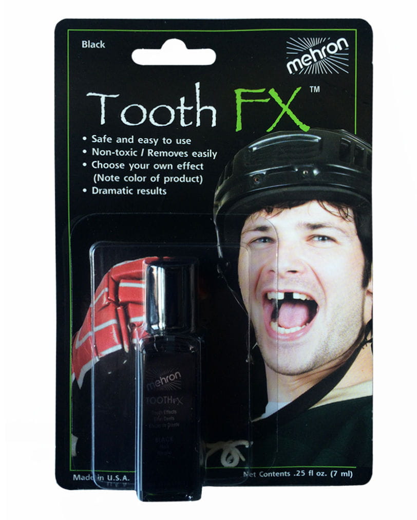 Zahnlack Schwarz 4ml Schwarzer Zahnlack um damit ausgefallene Zähne zu simulieren Um an Halloween und Karneval ein richtig fieses Make Up, mit fehlenden oder verfaulten Zähnen, zu schminken, benötigst Du für Deine Zähne einen Spezial-Zahnlack. Der aus der Film- und Theaterindustrie nicht wegzudenkende Zahnlack ermöglicht es Dir schnell und unkompliziert Lücken im Gebiss vorzutäuschen oder Zahnstummel darzustellen. Der Zahnlack wird einfach mit dem dazugehörigen Pinsel auf deine Zähne aufgetragen. Die einfachste Art um als Fetzen Zombie Kostüm mit verrottenden Zähnen zu glänzen oder als Unfall / Crash FX Make Up Kit ausgeschlagene Zähne zu kriegen. Inhalt: 4ml Farbe: Schwarz lässt sich hinterher wieder mit Alkohol und Wattestäbchen entfernen Zahnlack nicht auf Zahnkronen oder künstlichen Zahnersatz auftragen!