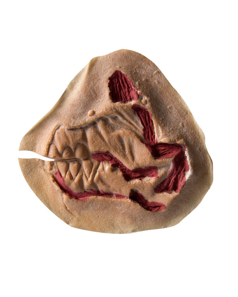 Zombie Gebiss Applikation aus Latex Realistische Kieferwunde für Halloween und Zombie Walks Mit der Zombie Gebiss Applikation aus Latex wirst du zu einem krassen Zombie. Die Maske wird mit Hautkleber angebracht, sodass man sich selbst schminken kann. Das verleiht dir einen individuellen Look, den es so nur einmal gibt. Die ungeschminkte Zombie Gebiss Applikation aus Latex stellt eine fiese und blutig freiliegendes Zombie Gebiss dar. Die verwundeten Stellen sind rot eingefärbt. Die Lippen sind bereits bis zur Unkenntlichkeit abgenagt, sodass Zahnfleisch sowie die Zähne freiliegen. Mit einem Mastix Hautkleber wird die Applikation auf das eigene Gesicht aufgeklebt, dabei arbeitet man sich Schritt für Schritt nach außen. Danach kann sie geschminkt werden. Sollte die Wunde nicht zu dem eigenen Gesicht passen, dann kann sie vor der Benutzung mit einer spitzen Nagelschere zugeschnitten werden. Lieferumfang: 1 x Zombie Gebiss Applikation aus Latex Inhalt: ungeschminktes Zombie Gebiss Farbe: hautfarben/rot Material: 100% Latex Zombie Mundwunde zum selber schminken. Achtung: Der Artikel ist ein Kostümzubehör für Erwachsene und kein Spielzeug. Nicht für Kinder unter 3 Jahren geeignet. Kann Kleinteile enthalten, die verschluckt werden können – Erstickungsgefahr. Von Feuer und offenen Flammen fernhalten.