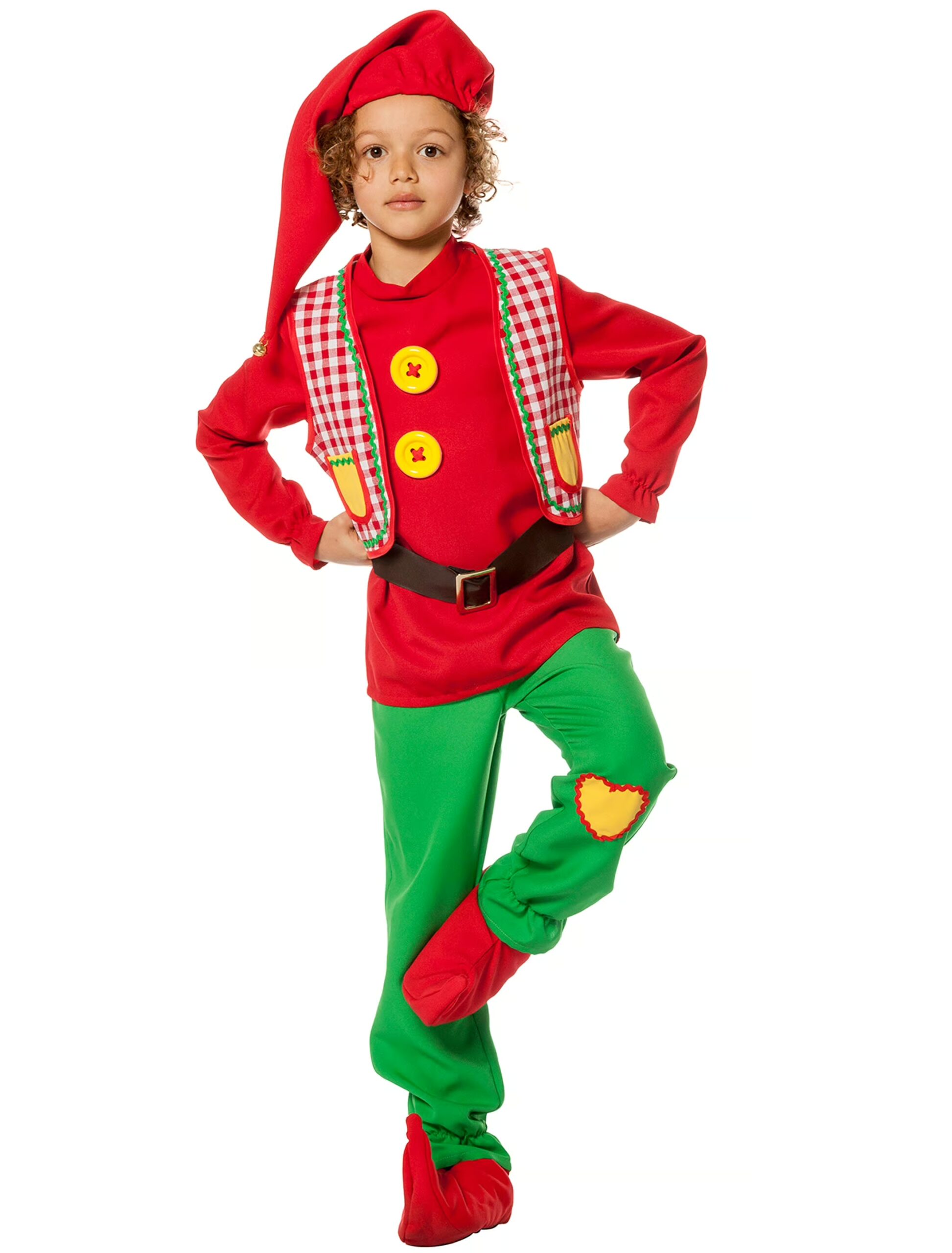 Ein peppiges und fünfteiliges Zwergenkostüm für Jungen mit langer roter Zipfelmütze, rotem Langarmshirt mit hohem Rundhalsausschnitt, langer grüner Hose, kecker Weste und schwarzem Gürtel mit silberfarbener Schnalle. Das freche Shirt hat vorne zwei übergroße gelbe Knöpfe und liegt hinter den Handgelenken durch einen leichten Gummizug bequem am Arm an. Auf der Hose prangt in Höhe des linken Knies ein lustiges, großes und gelbes Herz, das mit roter Zackenlitze eingefasst ist. Auf die schelmische rot-weiß-karierte kürzere offene Weste sind vorne zwei gelbe Taschen genäht, die oben mit grüner Zackenlitze verziert sind und an den anderen drei Seiten mit roter Zackenlitze. Die fröhliche Weste ist rundum mit schmalem Band rot eingefasst. An den Außenkanten ist sie neben der roten Paspelierung zusätzlich mit extra lausbubig wirkender grüner Zackenlitze versehen. Der breitere schwarze Gürtel rundet das Outfit stilecht ab. Ein schönes Kostüm zu Karneval und Fasching.